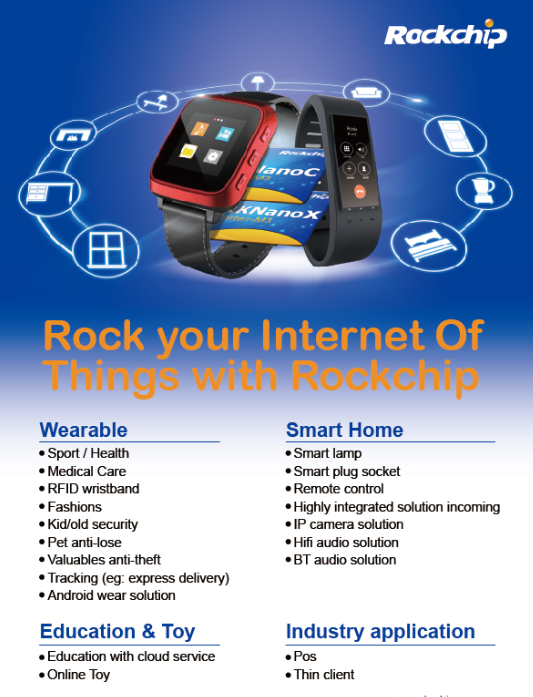 瑞芯微的IOT产品如智能手表及家居系列采用ARM Cortex M系列内核,不同于以往以A9、A15、A17等为代表的应用处理器,M系列处理器其实是微控制器,适用于智能调温器、智能手表、集成电路能耗管理单元等要求低功耗的产品上,有利于促进形成物联网与可穿戴设备的市场。