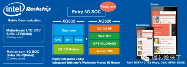 本次展会上,瑞芯微发布了首款进入通讯市场的入门级3G芯片——XG632,该方案定位于3.5寸-7寸手机(或通话平板)产品,集成度高与成熟的基带技术,是该SOC方案的最大特性,在入门级通讯方案中具很强的竞争力。